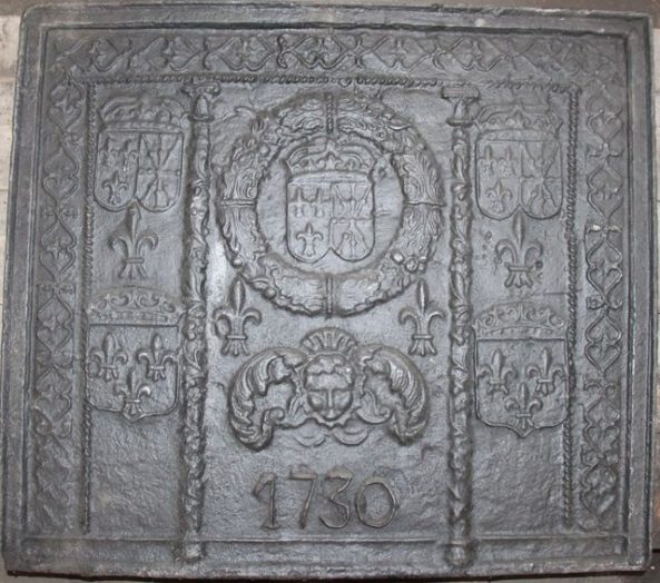 Richement ornée, cette plaque présente un encadrement de cœurs affrontés et stylisés à l’intérieur duquel l’espace est divisé en trois parties séparées de pilastres ronds fleuris. L’espace central est occupé dans sa partie supérieure par les armes de France et de Navarre entourées d’une couronne de végétaux, d’un visage d’angelot et de la date de 1730. Les espaces latéraux, en symétrie, comportent les armes de France et de Navarre en dessous desquelles figurent les armes de France. L’ensemble est parsemé de quatre fleurs de lys.