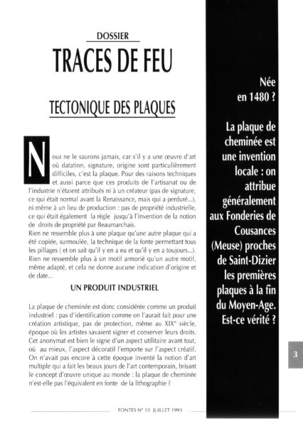 Contient : Brève histoire de la plaque de cheminée ; Les plaques, représentation de l’univers ; Quelques points techniques ; Aujourd’hui que vend-on à Dommartin-le-Franc ? ; Catalogue thématique de l’exposition 1993 : de taque en taque, “traces de feu” ; La plaque, c’est l’homme.
