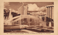 Exposition internationale Paris 1937 – Jardins et bassins du Trocadéro – Au fond les pavillons de la Norvège et de l’Allemagne