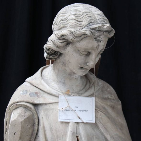 Modèle de fonderie en plâtre représentant un ange gardien, en pied, auprès duquel se tient un enfant, lui aussi en pied à la gauche de l’ange.