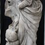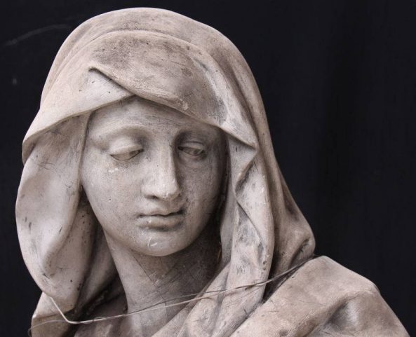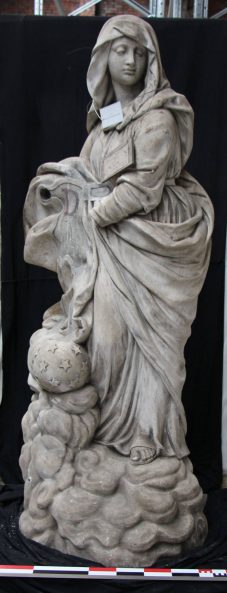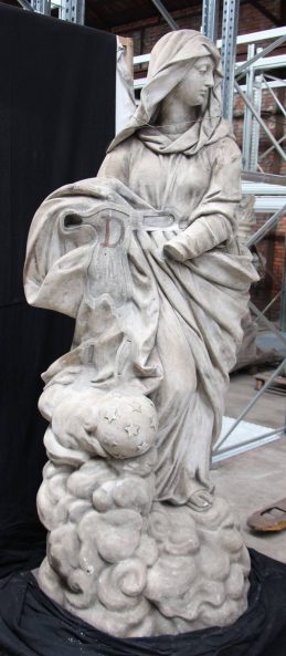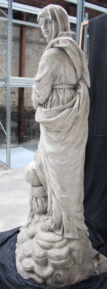 Modèle de fonderie en plâtre représentant Notre-Dame des Victoires, en pied sur des nuées, avec l’Enfant debout sur une sphère étoilée. Le modèle pouvait-être avec ou sans couronne.