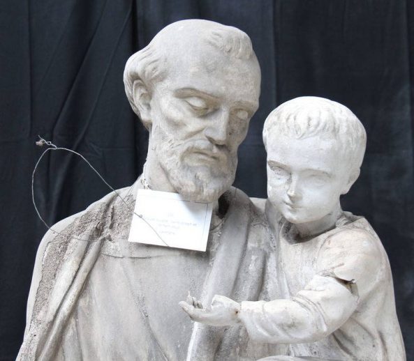 Modèle de fonderie en plâtre et représentant saint Joseph, en pied, portant l’Enfant Jésus sur son bras gauche et tenant un lys de sa main droite.