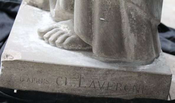 Modèle de fonderie en plâtre d'après Claudius Lavergne (1815-1887). Les œuvres de Claudius Lavergne sont toutes religieuses. L'artiste avait des convictions religieuses affirmées. Il expose au Salon de 1838 à 1878. D'autres modèles du sculpteur sont édités à la fonderie de Bussy, modèles signés par l'artiste et non présentés comme "d'après Claudius Lavergne".Manque(s)
