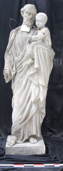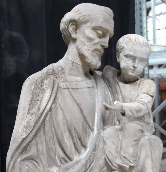 Modèle de fonderie en plâtre représentant saint Joseph en pied, l’Enfant Jésus aux attributs du Saint-Cœur assis sur son bras gauche.