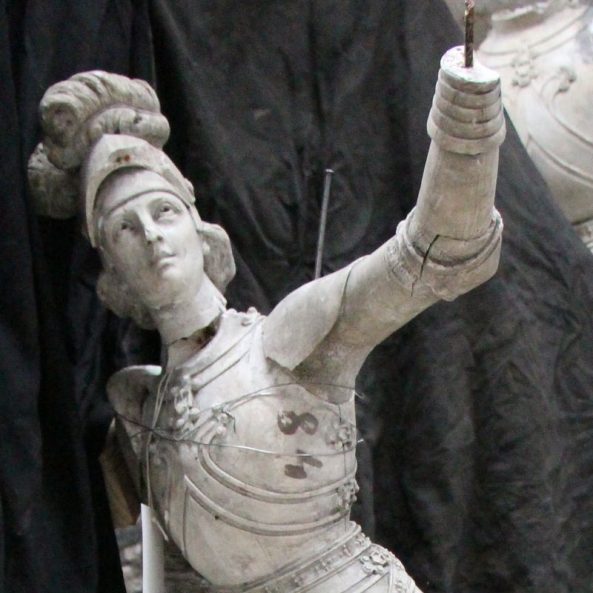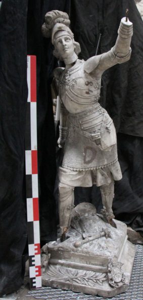 Modèle de fonderie en plâtre représentant Jeanne d’Arc en cuirasse, en pied, brandissant un oriflamme dans la main gauche et tenant une épée dans la main droite. Le regard est tourné vers l’étendard. Sur la terrasse du socle sont disposés une masse d’armes et un casque.