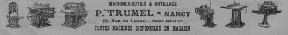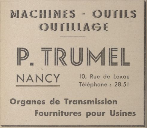 Maison de vente d’outillage, de machines-outils et d’appareils divers pour l’industrie fondée par Pierre Marie Constant Trumel (1878-1971) sous la raison sociale Machines-outils modernes P. Trumel (au moins en 1925), sise 10 rue de Laxou à Nancy. Elle possédait plusieurs dépôts, notamment à Strasbourg (au moins en 1959), Metz, Mulhouse, Besançon et Charleville. La société avait l’importation exclusive pour la France des tours à commande numérique japonais de la marque Mazak, précurseurs des machines à commande numérique modernes. En 1923, une autorisation pour la construction d’un bâtiment de dépôt de marchandises et un logement de gardien rue François-de-Neufchâteau à Nancy fut déposée. La raison sociale évolua pour devenir Société des établissements Pierre Trumel avant 1961 et au moins jusqu’en 1981, année où l’entreprise semble avoir été achetée par Orexad, société sise à Lyon. Un établissement secondaire de cette dernière a vu le jour en 2010 sous la raison sociale Orexad – Trumel, au 53 rue Emile Levassor à Ludres (Meurthe-et-Moselle).