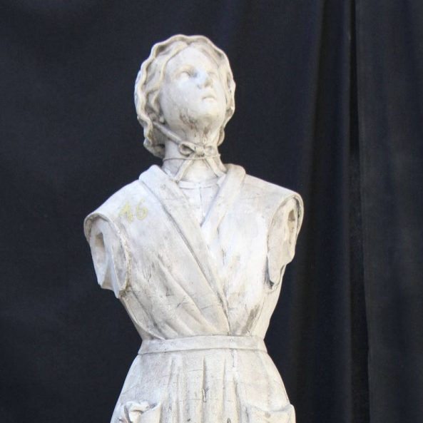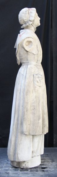 Modèle de fonderie en plâtre représentant une jeune fille, Mélanie Calvat (1831-1904), écoutant Notre-Dame de la Salette. Elle est vêtue d’une robe paysanne. Sa tête est couverte d’un fanchon. Le modèle est recouvert d’un enduit beige.