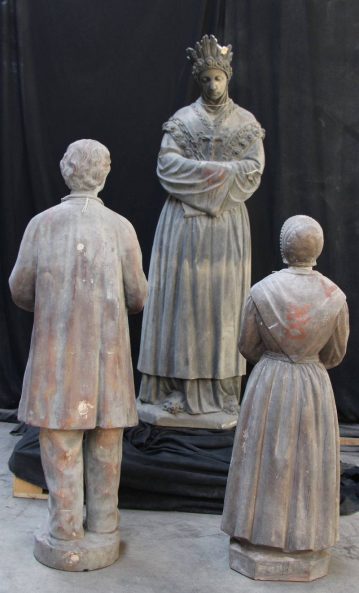 Modèle de fonderie en terre cuite représentant Notre-Dame de la Salette, en pied, les bras croisés. Un enduit noir recouvre le modèle.
