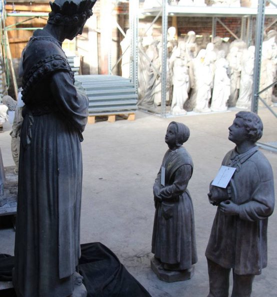 Modèle de fonderie en terre cuite diffusé par la Maison Gousset à Lyon. Il est mentionné dans l'inventaire de 1896 qui fait suite à la reprise des fonderies Denonvilliers par le Comptoir général des fontes d'art, de bâtiment et de fumisterie, détenu par Auguste Salin et Edmond Capitain. Le dit inventaire ne mentionne jamais la Maison Gousset et attribue ses modèles à la Maison Vermare. A t-elle été acquise par cette dernière à la fin du 19e siècle ? Ce modèle constitue à l'origine un groupe sculpté qui comprend un jeune garçon et une jeune fille. Notre-Dame de la Salette est apparue en pleurs à deux enfants le 19 septembre 1846 en haut du village de La Salette-Fallavaux, près de Corps (Isère).État de conservation