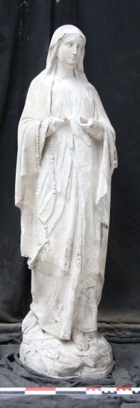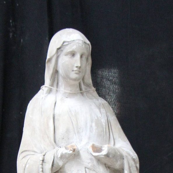 Modèle de fonderie en plâtre représentant Notre-Dame de Lourdes, portant à l’avant-bras droit un chapelet. La tête peut-être inclinée à droite ou à gauche.