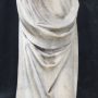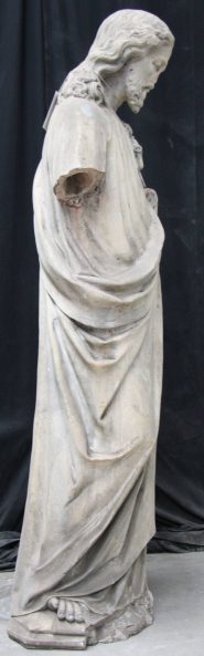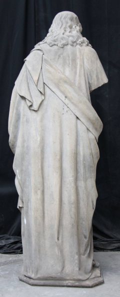 Le nez est mutilé. Plusieurs cassures dans la barbe du saint et en partie basse du vêtement drapé, en face avant. Le socle est cassé.Description: