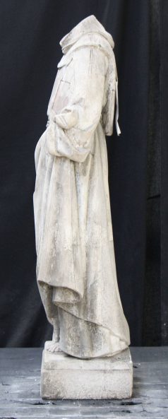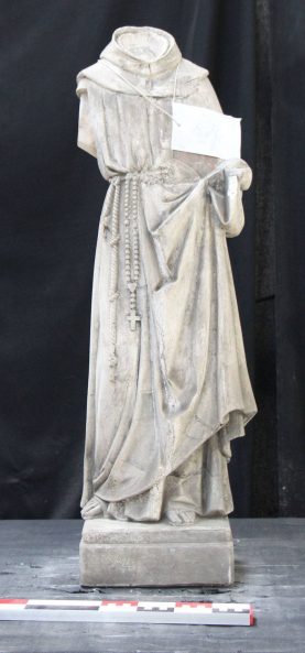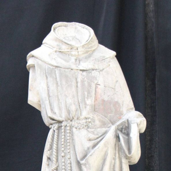 Modèle de fonderie acéphale en plâtre représentant saint Antoine de Padoue, en pied. Il est vêtu d’une bure franciscaine nouée par une cordelière à trois nœuds. Un chapelet est noué à cette dernière.