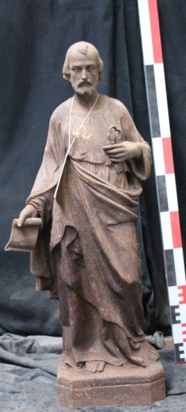 Reproduction en fonte de fer représentant saint Pierre, en pied, tenant une clef dans la main gauche et un livre ouvert dans la main droite (manquant).
