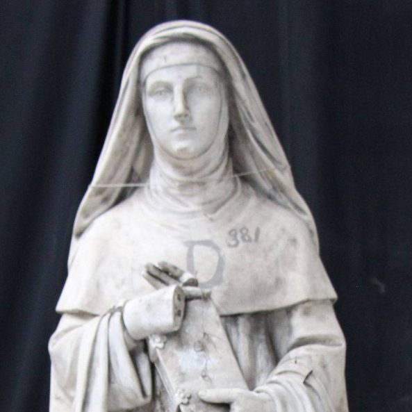 Modèle de fonderie en plâtre représentant sainte Gertrude de Helfta, en pied, en habit monastique des Cisterciennes. Elle tient un livre de ses deux mains.Sainte Gertrude d’Helfta (1256-c.1301), est une moniale cistercienne allemande. Gratifiée de grandes faveurs mystiques elle compte parmi les figures majeures de la Mystique rhénane et est considérée comme une des initiatrices de la dévotion au Sacré-Cœur.