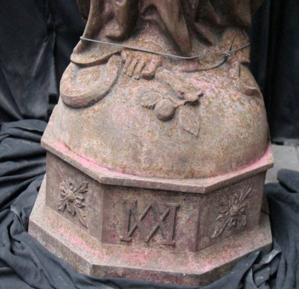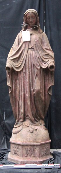 Modèle de fonderie en fonte de fer représentant une Vierge Immaculée, en pied. Elle a sous ses pieds un serpent et la lune. Elle prend place sur un socle octogonal ou alternent des ornements de forme végétale et le monogramme de la Vierge, composé des lettres A et M entrelacées. Le modèle est recouvert d’un enduit rouge.